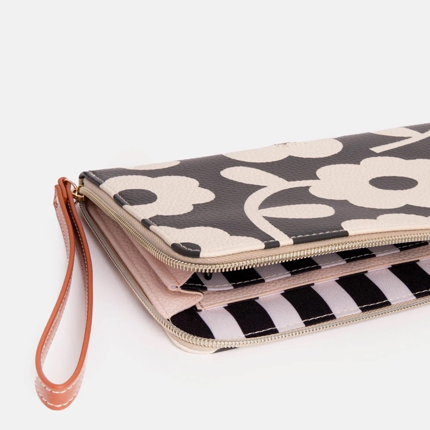 Eine wunderschöne Clutch für die nächste Reise! Die neue Reisebrieftasche bietet Platz für Karten, Bargeld, Pässe und Dokumente und verfügt über eine praktische Trageschlaufe für sicheren Transport unterwegs. Die Tasche präsentiert sich im neuen monochromen Blumenmuster mit kontrastierendem Streifenfutter.
