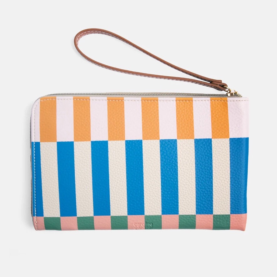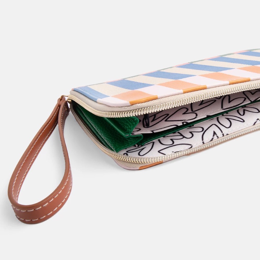 Die wunderschöne Clutch ist der ideale Reisebegleiter. Die Reisebrieftasche bietet Platz für Karten, Bargeld, Pässe und Dokumente und verfügt über eine praktische Trageschlaufe für sicheren Transport unterwegs. Die Tasche präsentiert sich in unserem neuen mehrfarbigen Streifenmuster mit kontrastierendem Herz-Futter.