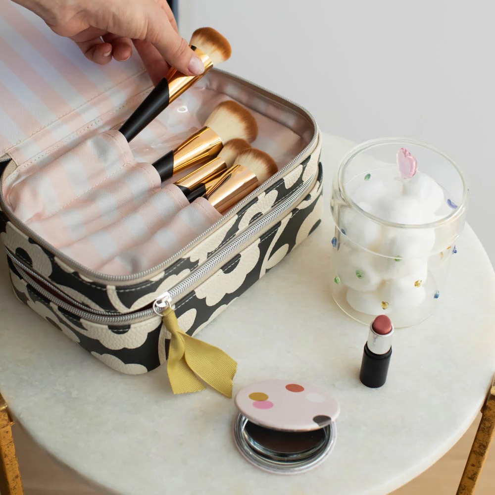Lernen Sie unseren Make-up-Organizer mit Blumenmuster kennen. Dieser wunderschöne Kosmetikkoffer verfügt über zwei Reißverschlussfächer: ein oberes mit Fächern für Pinsel und ein unteres für Make-up oder Toilettenartikel. Ideal für zu Hause, um Ihre Beauty-Utensilien geordnet aufzubewahren, oder als Kulturtasche für unterwegs.