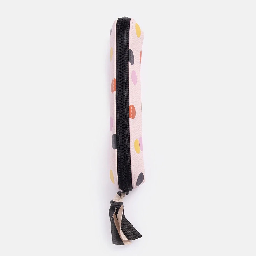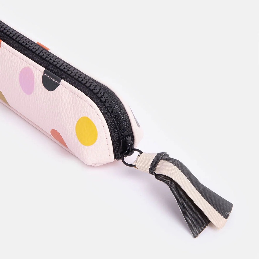 Verleihen Sie Ihrer Schreibwarensammlung mit unserem neuen Federmäppchen mit buntem Punktemuster einen Hauch von Farbe. Das schlanke Etui mit einfarbig gestreiftem Futter, schwarzem Reißverschluss und Ripsband bietet die ideale Größe für Schreibwaren, Make-up-Pinsel und Mascara.