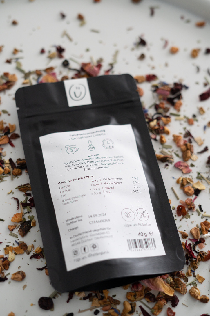 Zutaten: Apfelstücke, Ananaswürfel (Ananas, Zucker), Hibiskusblüten, Orangenschalen, Rote Bete, Aroma, Zitronenschalen, Granatapfelkerne, Bauernrosenblüten.