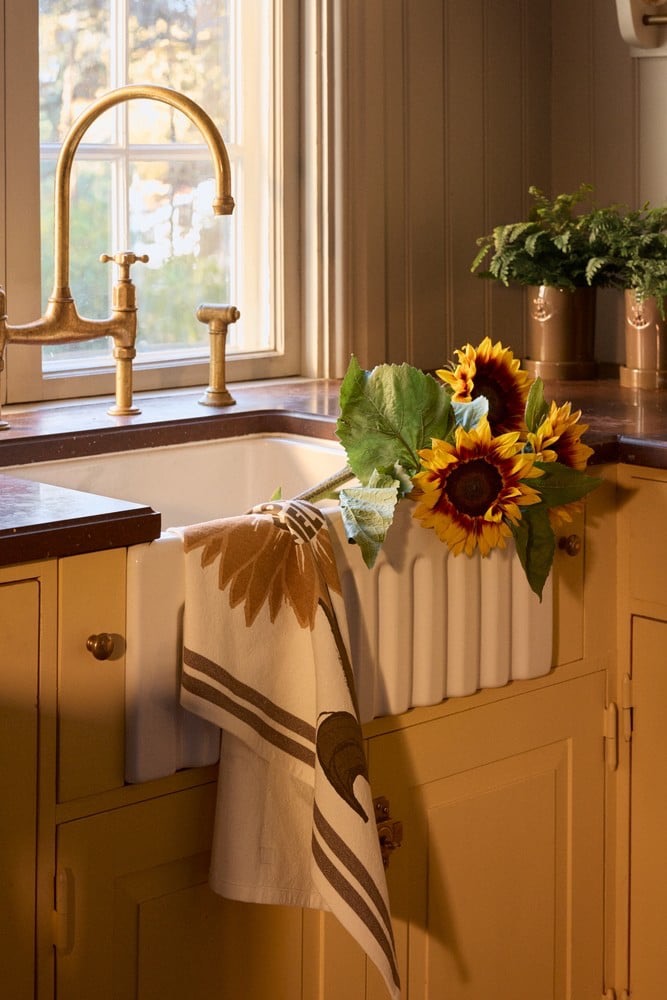 Dieses Küchentuch ist aus 100 % Bio-Baumwolle mit einer eleganten Fischgrätstruktur gefertigt, die Tiefe und visuelles Interesse verleiht. Mit einem charmanten saisonalen Sonnenblumenmuster und dem Lexington-Logo bringt dieses Handtuch eine warme, rustikale Ausstrahlung in Ihre Küche. Das Design wird durch garngefärbte Streifen an den Seiten für einen klassischen Küchenlook ergänzt, während der umgeschlagene Saum für ein sauberes, geschneidertes Finish sorgt. Zu den praktischen Elementen gehört ein bequemer Logo-Aufhänger für einfache Aufbewahrung. Verantwortungsbewusst in einer zertifizierten umweltfreundlichen Fabrik in Indien hergestellt, vereint dieses OEKO-TEX®-zertifizierte Handtuch Nachhaltigkeit mit Lexingtons charakteristischer Qualität und Stil.