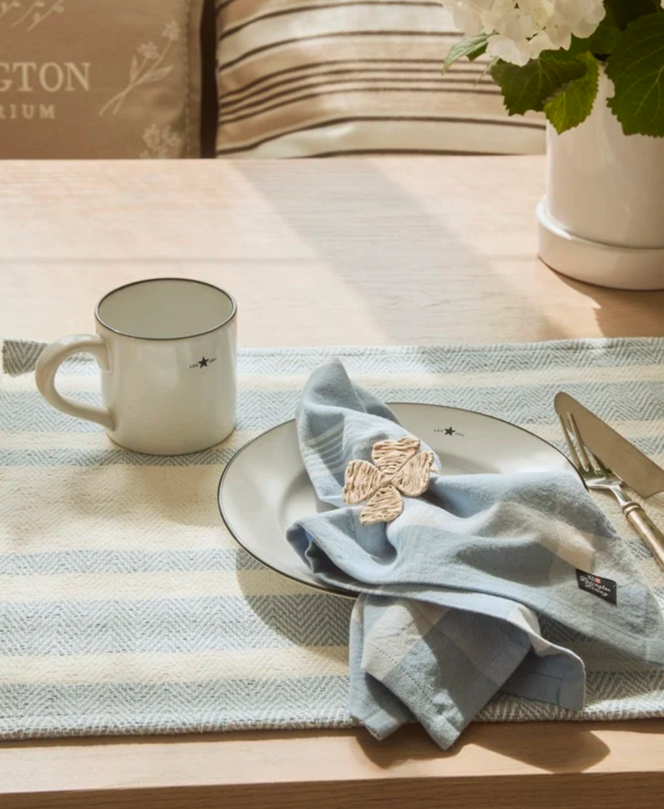 Verschönern Sie ihren Tisch mit diesem zeitlosen gestreiften Tischset. Es hat ein Fischgrätmuster ist aus 100 % Biobaumwolle in sanftem himmelblau und weiß. Entdecken Sie auch die passende Tischdecke, Servietten, Geschirrtücher und Kissen aus der Kollektion.