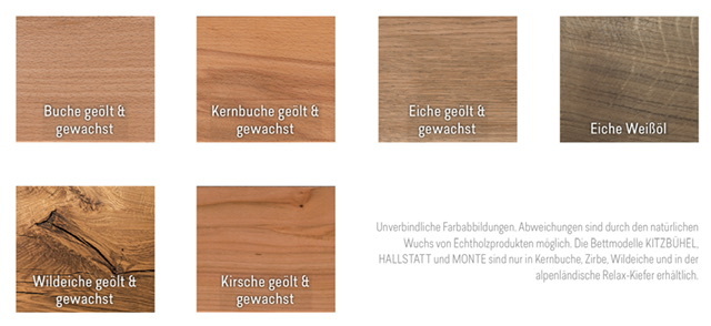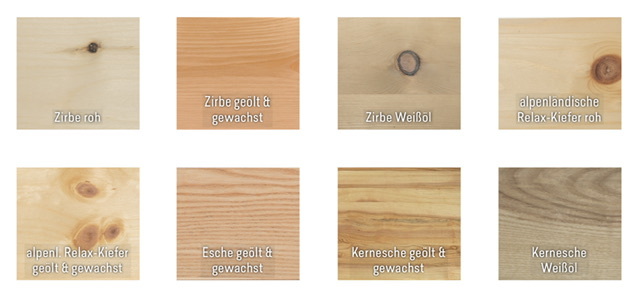| Holzart: | Alpenländische Kiefer geölt u. gewachst, Alpenländische Kiefer roh geschliffen, Buche geölt u. gewachst, Eiche Weißöl, Eiche geölt u. gewachst, Esche geölt u. gewachst, Kernbuche geölt u. gewachst, Kernesche Weißöl, Kernesche geölt u. gewachst, Kirschbaum geölt u. gewachst, Wildeiche geölt u. gewachst, Zirbe roh geschliffen |