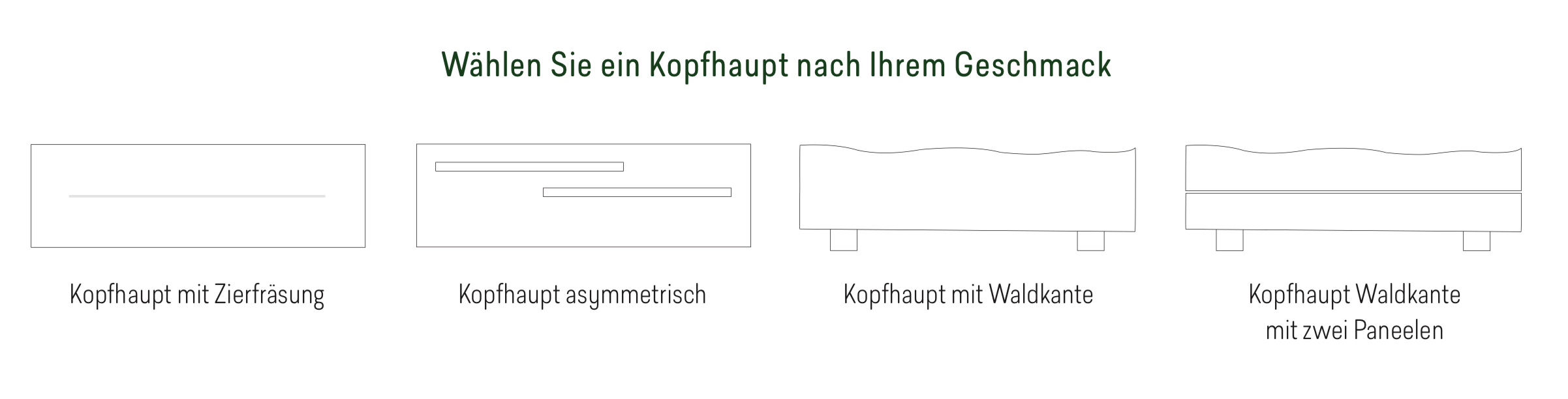 | Kopfhaupt: | 100 cm asymmetrisch, 100 cm mit 2. Paneele u. Waldkante, 100 cm mit Waldkante, 100 cm mit Zierfräsung, Als Liege ohne Kopfteil |