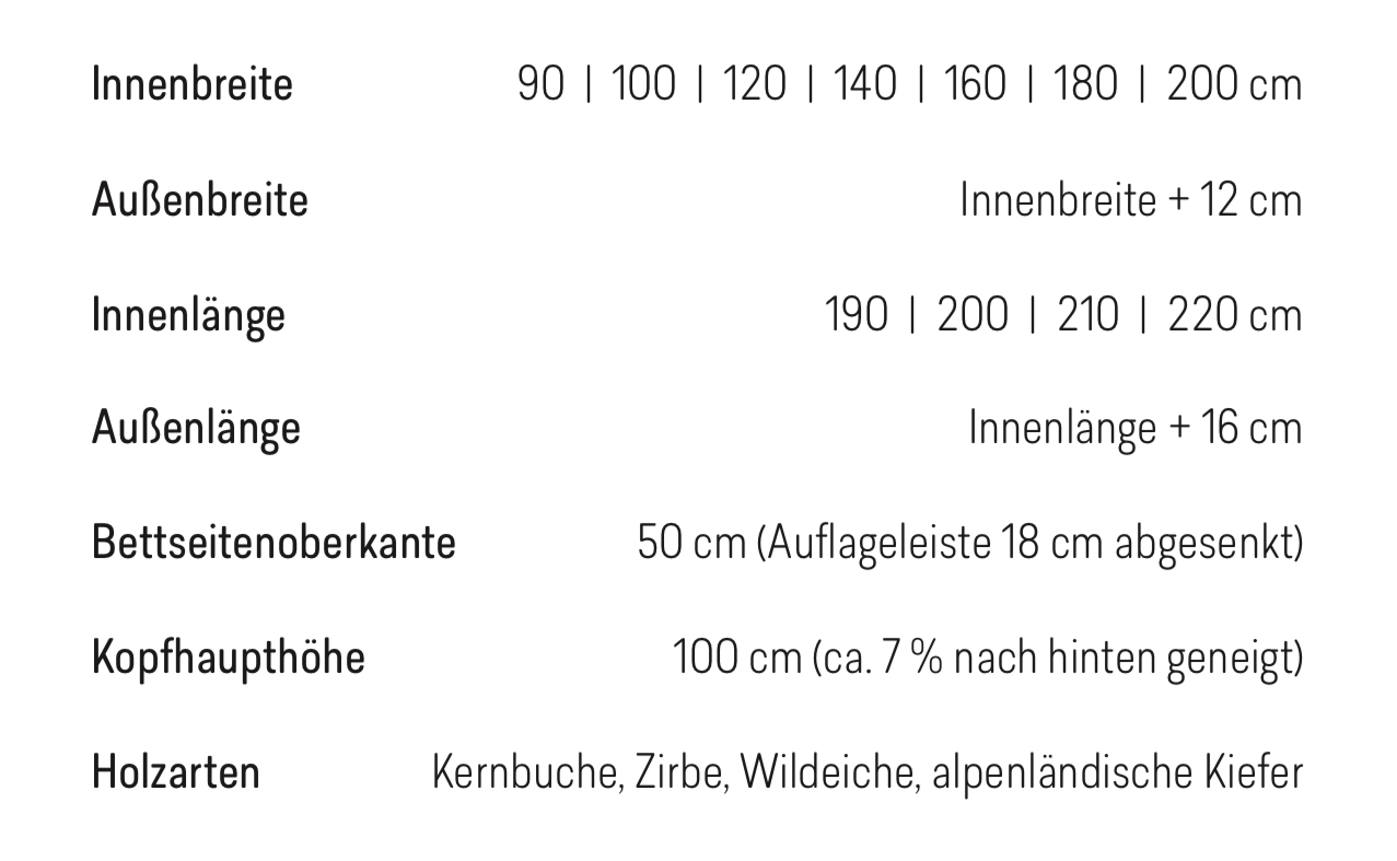 Innenbreite 90/100/120/140/160/180/200 cm Außenbreite Innenbreite + 12 cm Innenlänge 200/210/220cm Außenlänge Innenlänge + 16 cm Bettseitenoberkante 50 cm (Auflageleiste 18 cm abgesenkt) Kopfhaupthöhe 100 cm (ca. 7 % nach hinten geneigt) Zu den Massivholzbetten
