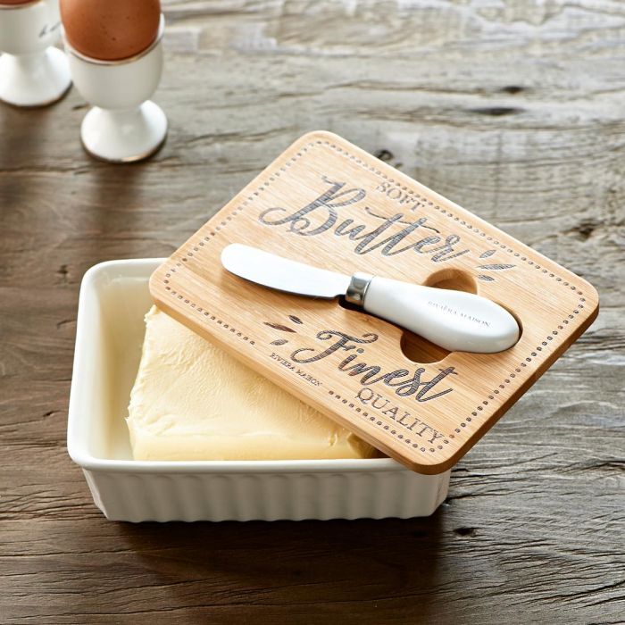 Diese Butterdose aus Porzellan ist eine wahre Augenweide. Der Holzdeckel bietet Platz für ein passendes Buttermesser, sodass Sie dieses immer zur Hand haben, wenn Sie sich ein Brot bestreichen möchten. Dank der Aussparungen seitlich des Buttermessers können Sie es mühelos hinausnehmen.