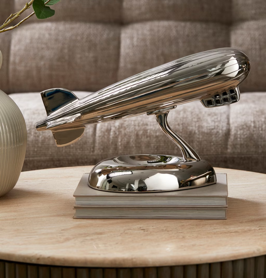 - Diese silberne Dekostatue eines Zeppelins aus Aluminium ruht auf einem eleganten organischen Fuß. Ihre raffinierten Details machen sie zu einem echten Hingucker, der jedem Raum einen Hauch von Abenteuer und Raffinesse verleiht.