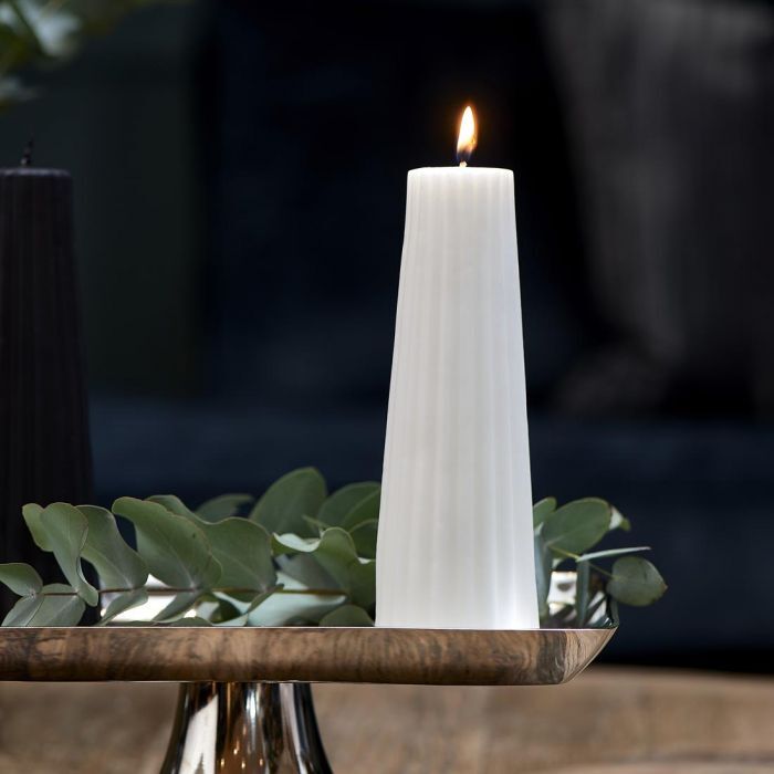 Mit ihrer gebrochen weißen Farbe ist diese konische Kerze mit vertikaler Rippenstruktur eine schöne Licht- und Wärmequelle. Die Oberfläche aus weißem Samt verleiht der Kerze ein mattes Aussehen. Stellen Sie die Kerze für zusätzliche Stabilität immer auf einen Untersetzer oder ein Brett. Hierdurch verhindern Sie auch, dass Kerzenwachs auf die Oberfläche tropft.