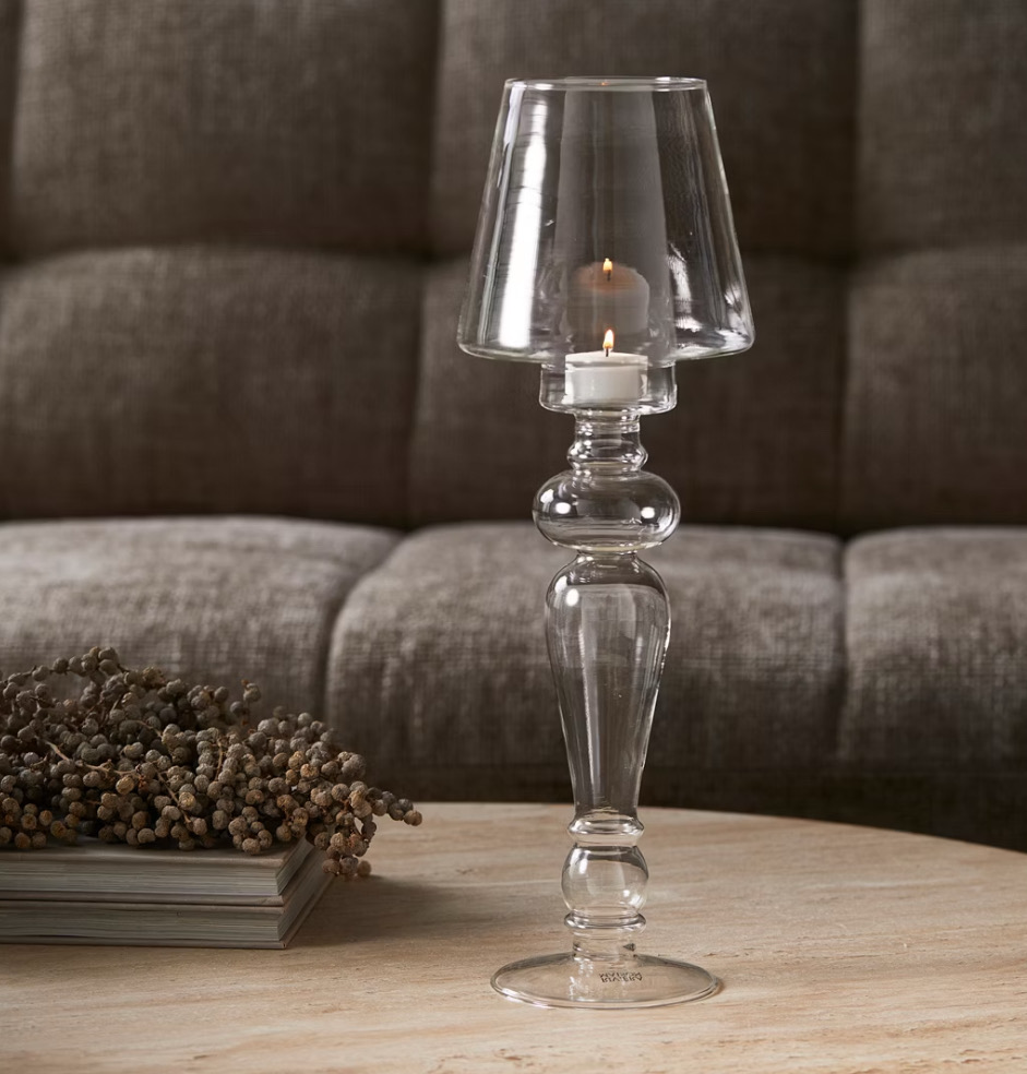 Ein wunderschöner Kerzenhalter in Form einer Tischlampe aus Glas. Ein wirklich einzigartiges Design, dass eine gemütliche und warme Atmosphäre schafft.