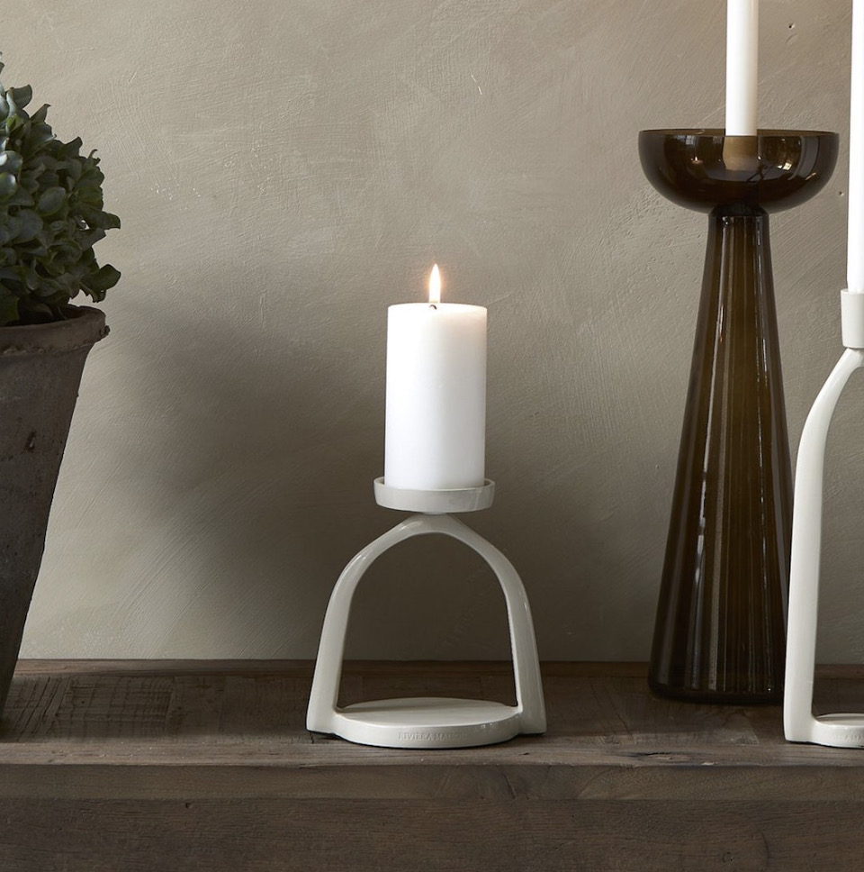 Der taupefarbene Kerzenhalter ist ideal für Stumpenkerzen geeignet. Ein tolles Detail in ihrer Dekoration.