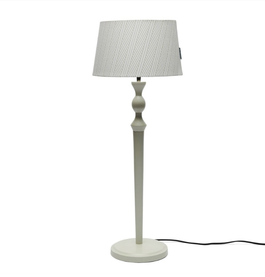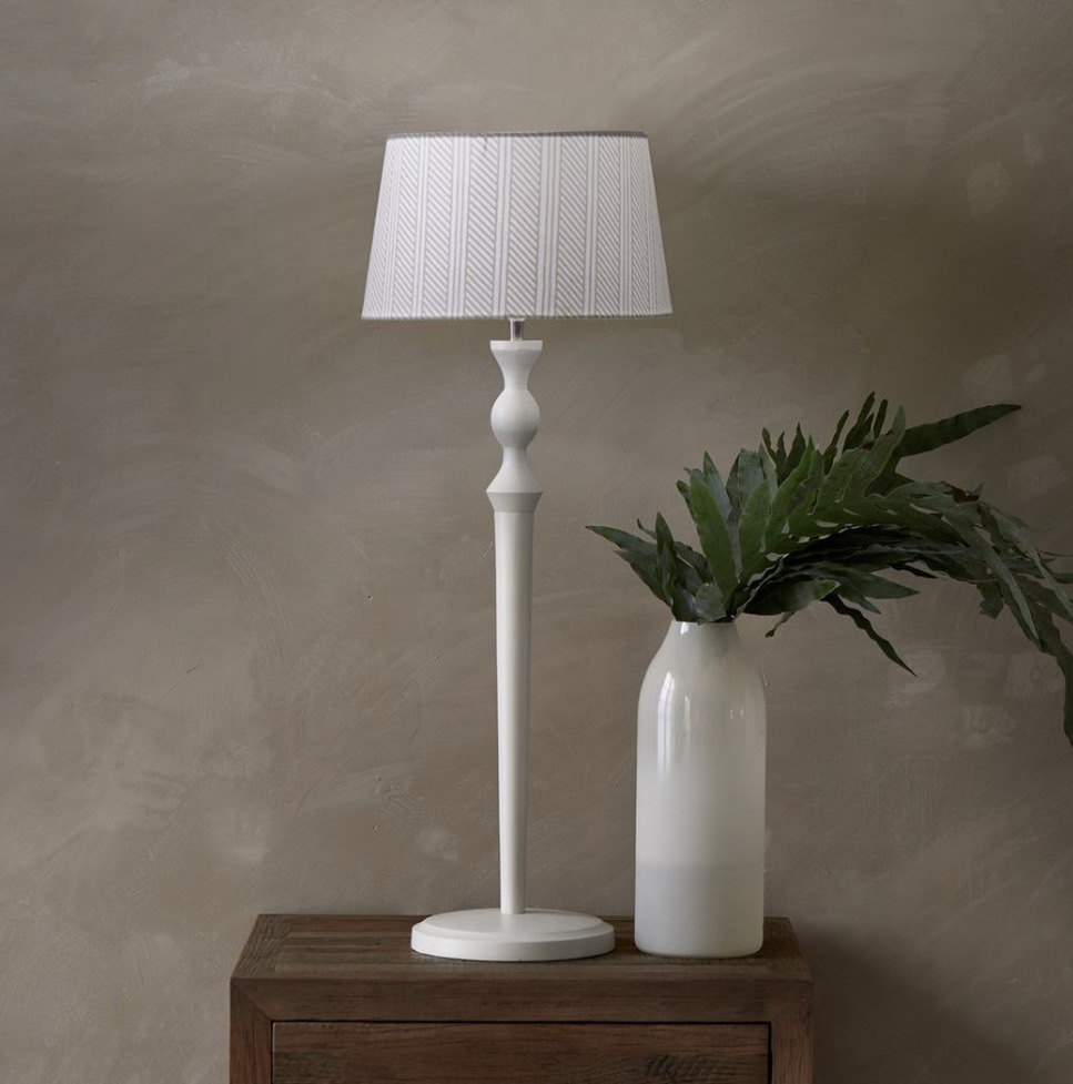 Ein wunderschöner Lampenschirm im Hamptonsstyle. Der mittelgroße Lampenschirm ist weiß mit beigen Streifen und einem weißen Aluminium rahmen an der Innenseite.