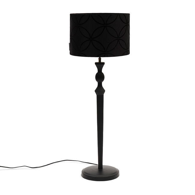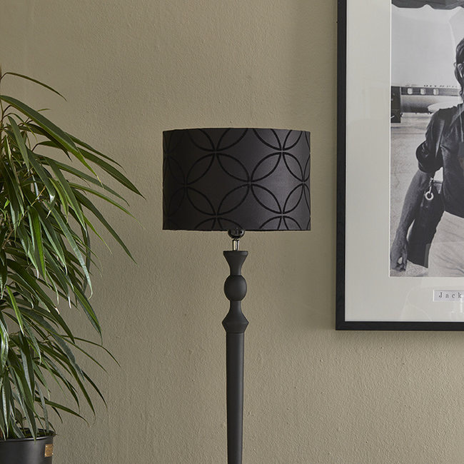 Der Olcay Cylinder Lampenschirm 20x30 ist ein runder, aber gerader Lampenschirm aus einem satten, schwarzen Stoff mit einem Samtblumendruck. Dieser luxuriöse, dekorierte Lampenschirm ist mittelgroß und passt auf jeden Standardfuß.