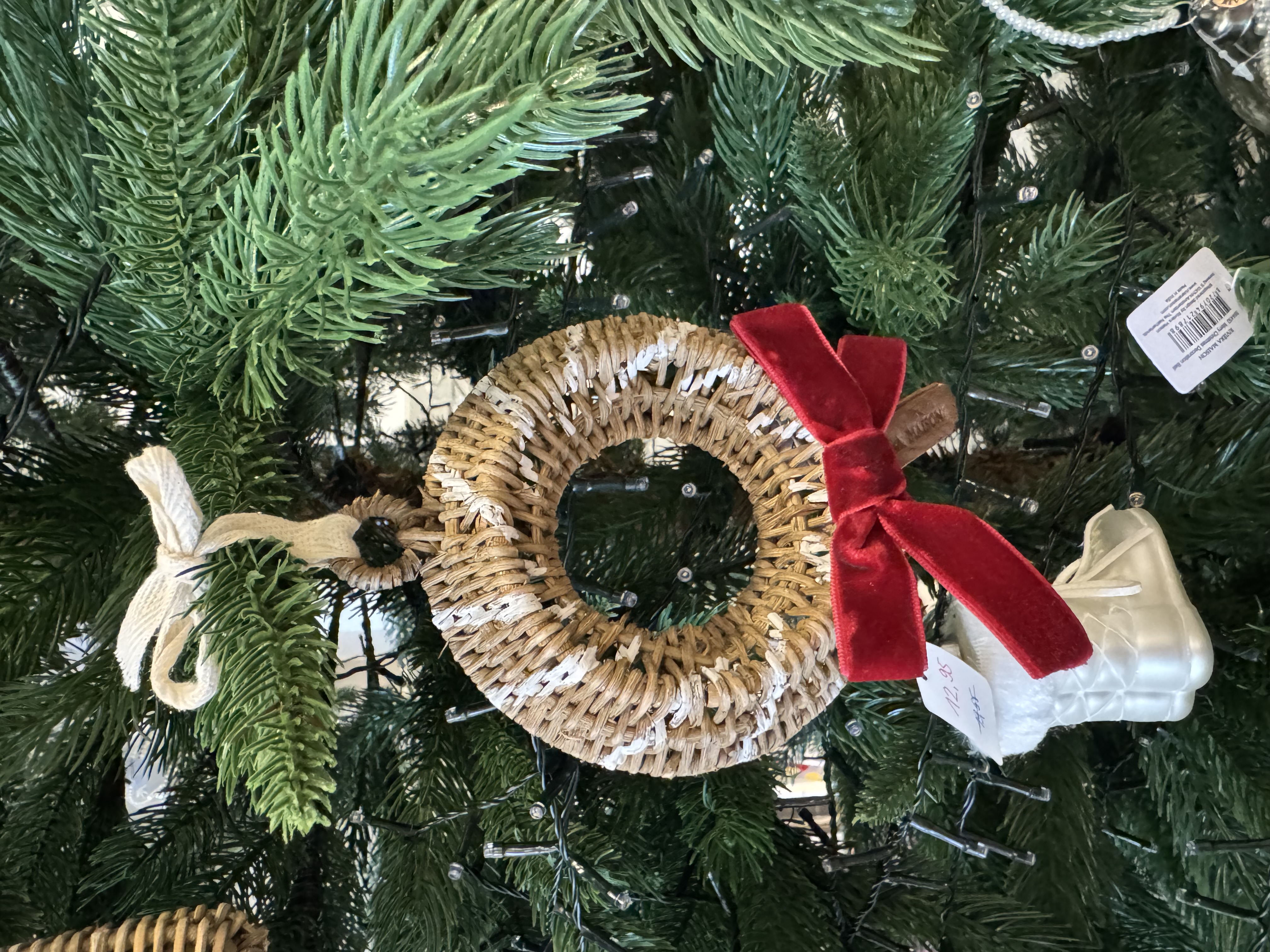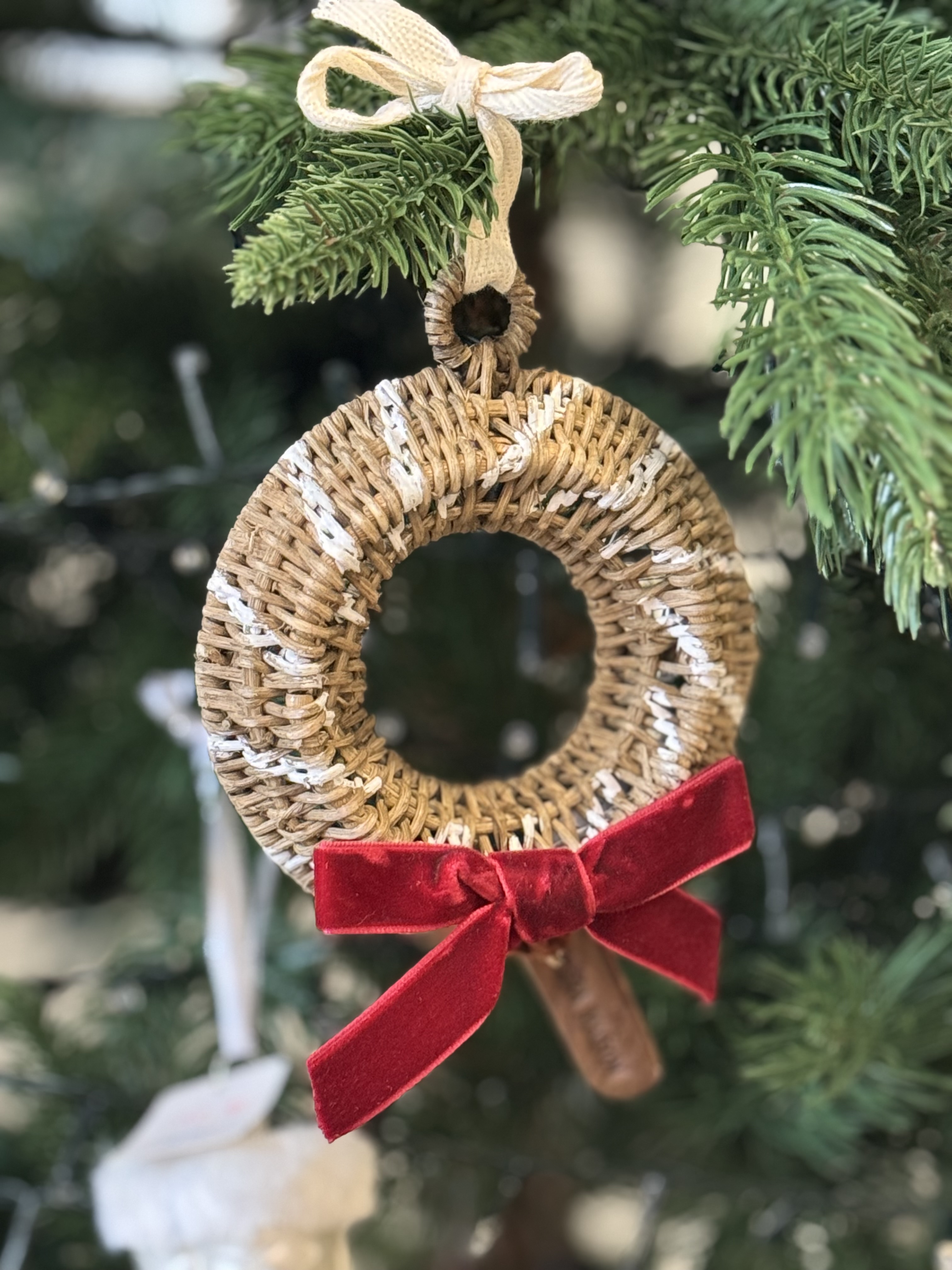 Landhaus Stil pur. Dieses zauberhafte Ornament für den Weihnachtsbaum oder für die Tür ist aus handgeflochtenem Rattan, inklusive einer schönen weinroten Samt Schleife. Eines der Highlights aus der beliebten Rustic Rattanserie von Rivièra Maison.