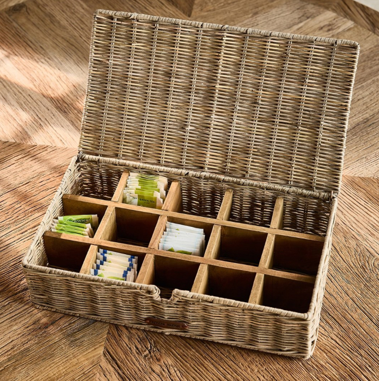 Tea Time! In diese rustikale Box lassen sich die vielen verschiedenen Teesorten aufbewahren. Die Rattan Box kann natürlich auch für andere Zwecke, wie zum Beispiel für Schmuck verwendet werden.