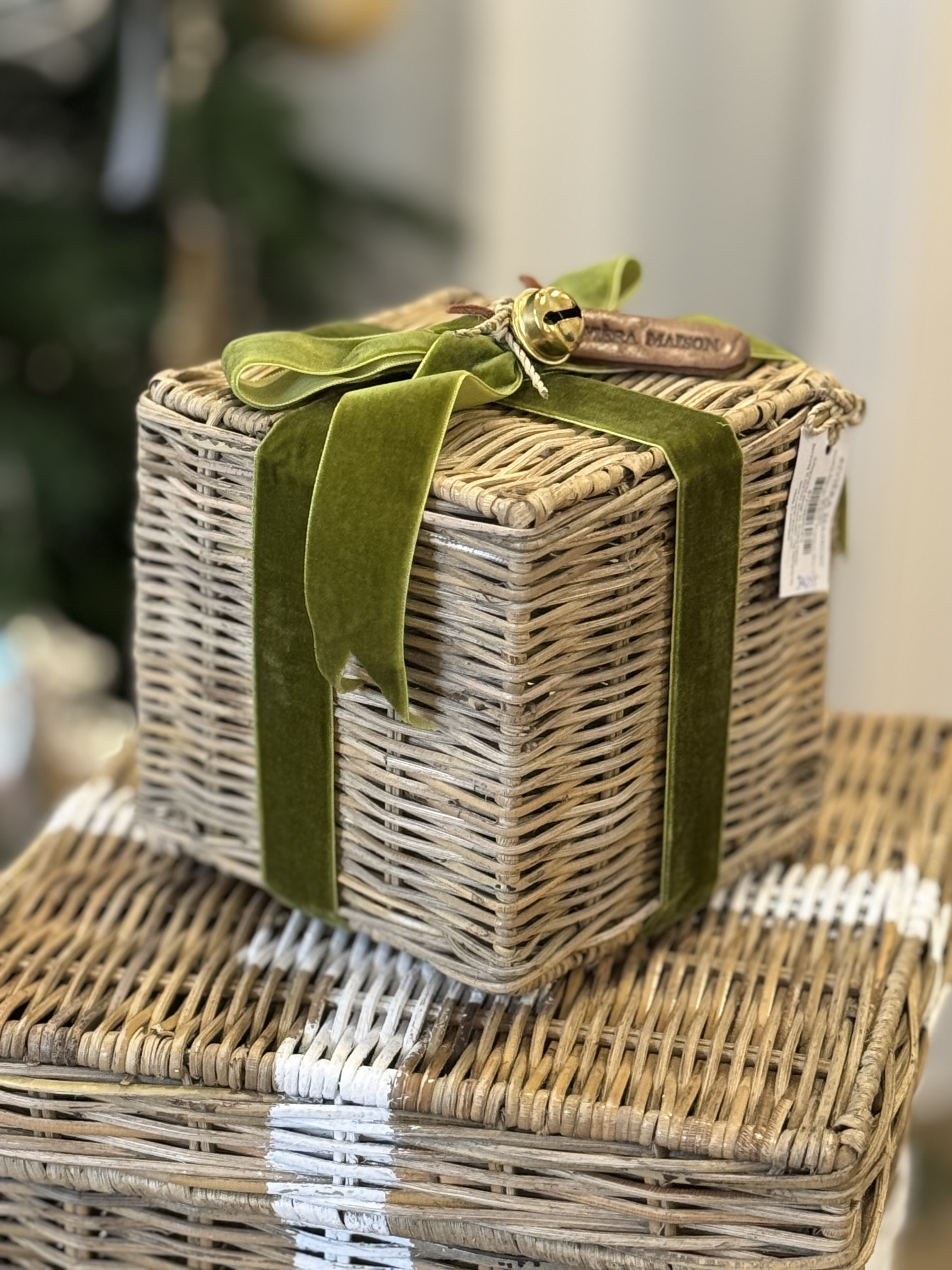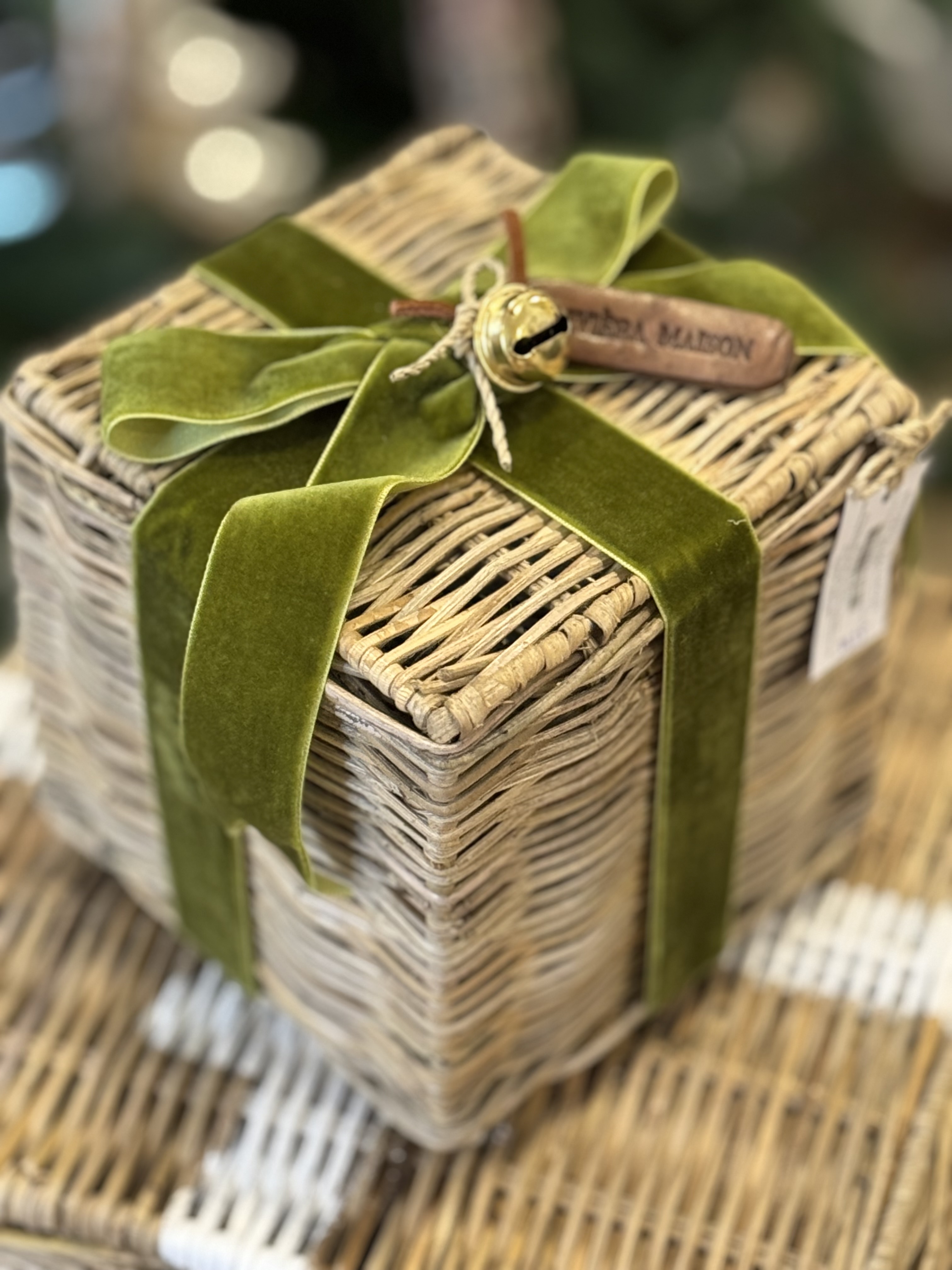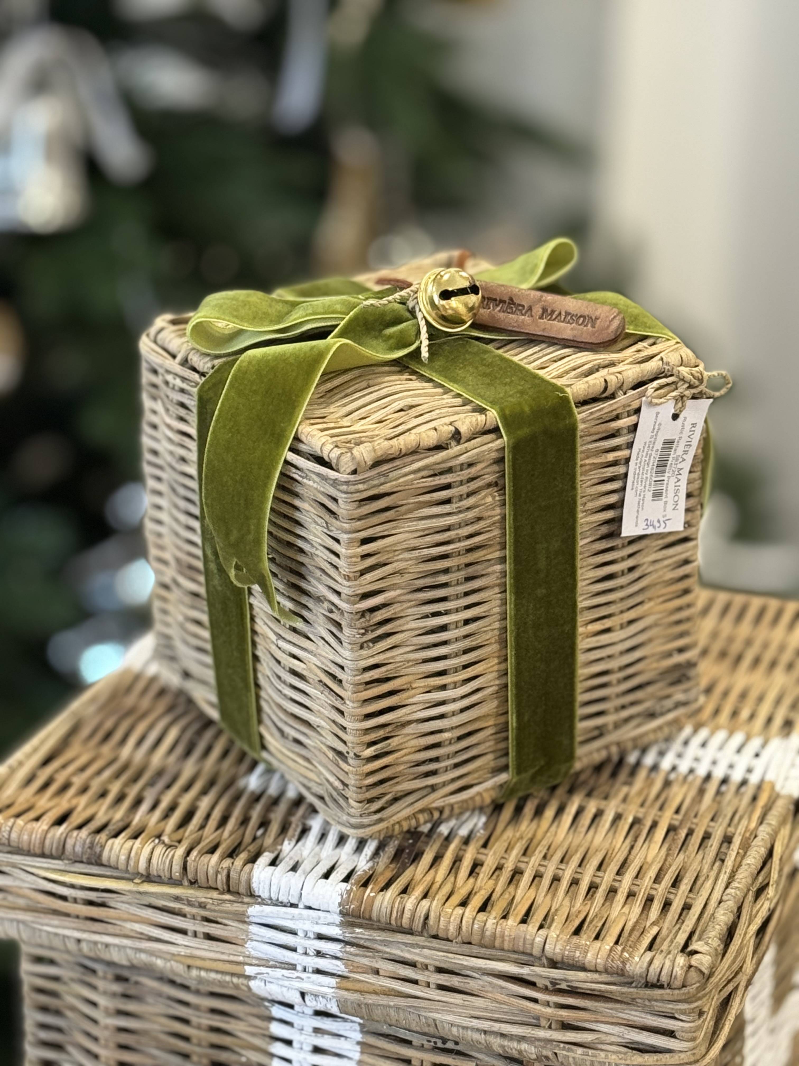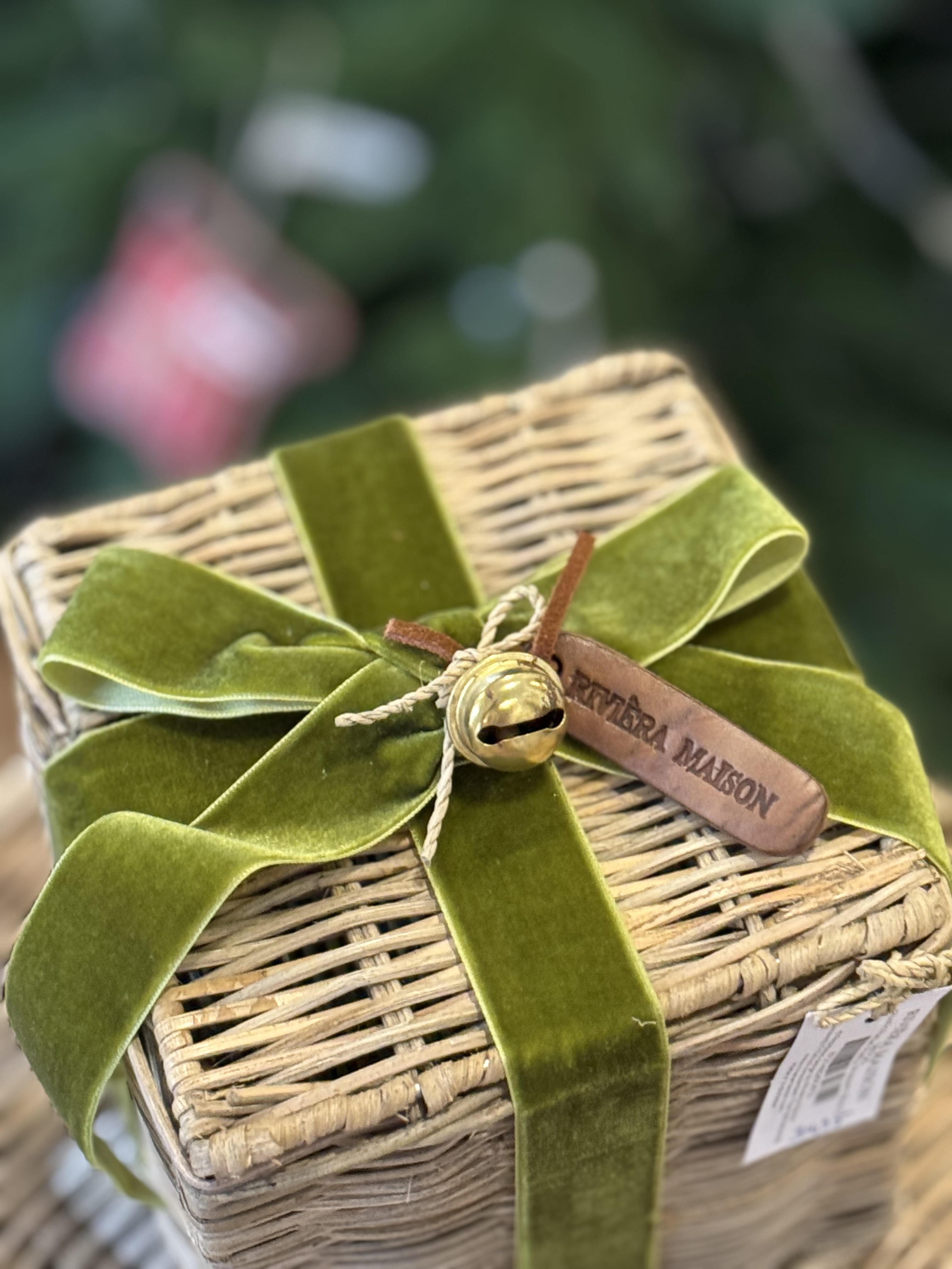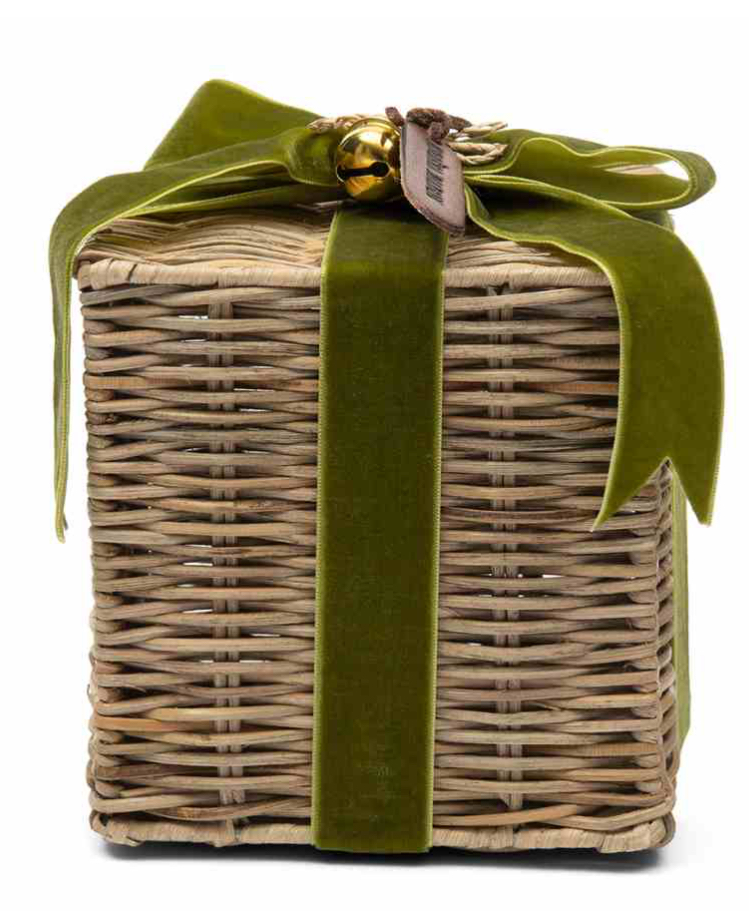 Einfach nur wow. Dieses wunderschöne Geschenk hat eine grüne Schleife aus Samt inklusive einem kleinen Glöckchen, das sogar leicht klingelt. Das Geschenk ist aus Hand, geflochtene Rattan und ein traumhaftes Accessoire aus der brandneuen Riviera Maison Winterkollektion.