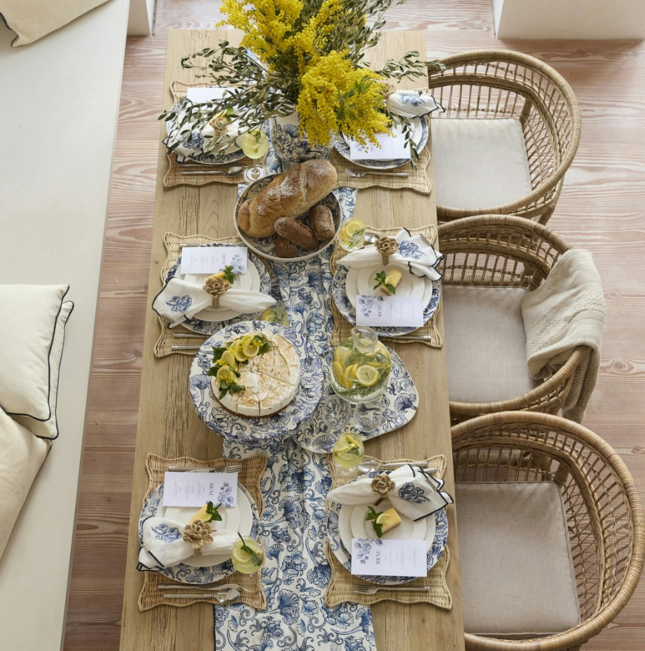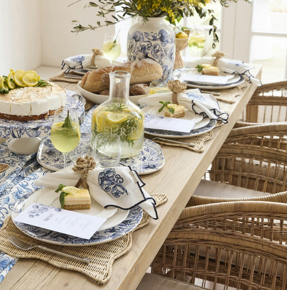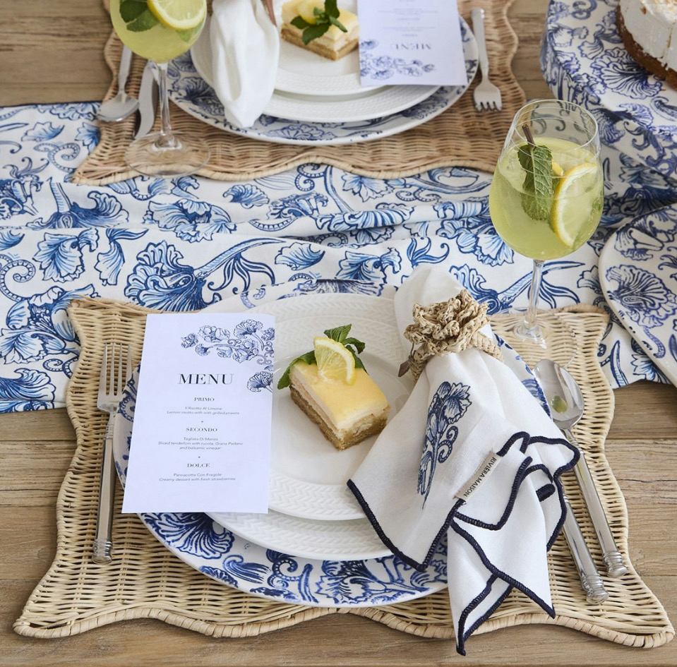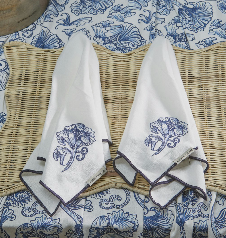 Die edlen Stoffservietten sind aus der neuen Amalfi Kollektion von Rivièra Maison. Sie lassen sich wunderbar zu dieser Geschirrserie kombinieren. Auf den weißen Servietten ist eine blaue Blume aufgestickt