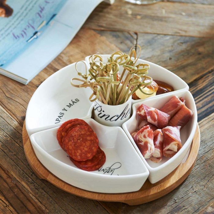 Die Tapas Platte sieht mega schön auf dem gedeckten Tisch aus. Sie eignet sich für alles Mögliche. Snacks, Dips und natürlich für klassische Tapas. Auch ein tolles Geschenk. Die Tapas Platte wird in einem hübschen Geschenkkarton geliefert. Die Schälchen sind aus Porzellan, das Tablett aus Holz.