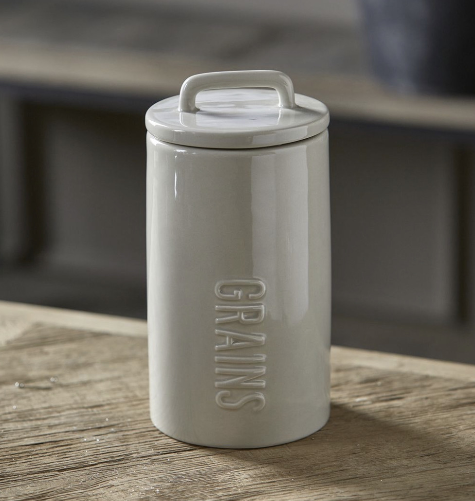 Das Flachsfarbene Vorratsgefäß hat eine glänzende Oberfläche mit dem Schriftzug Grains. Was bedeutet das? Müsli! Füllen Sie also ganz einfach Ihr Lieblingsmüsli darin ab.