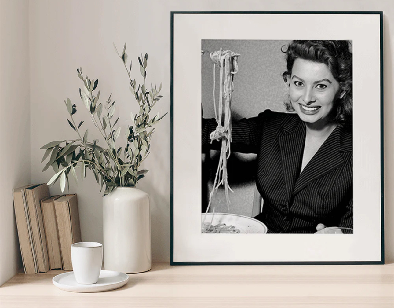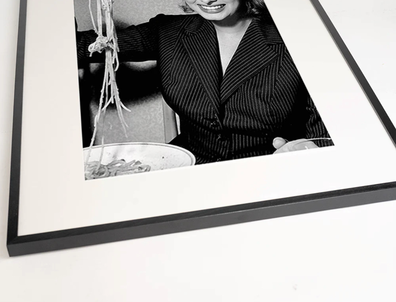 Ein Schwarz-Weiß-Bild von Sophia Loren, die spielerisch eine Gabel Spaghetti in die Kamera hält und warm lächelt. Verleiht jedem Raum einen Hauch von fröhlichem und zeitlosem Charme.