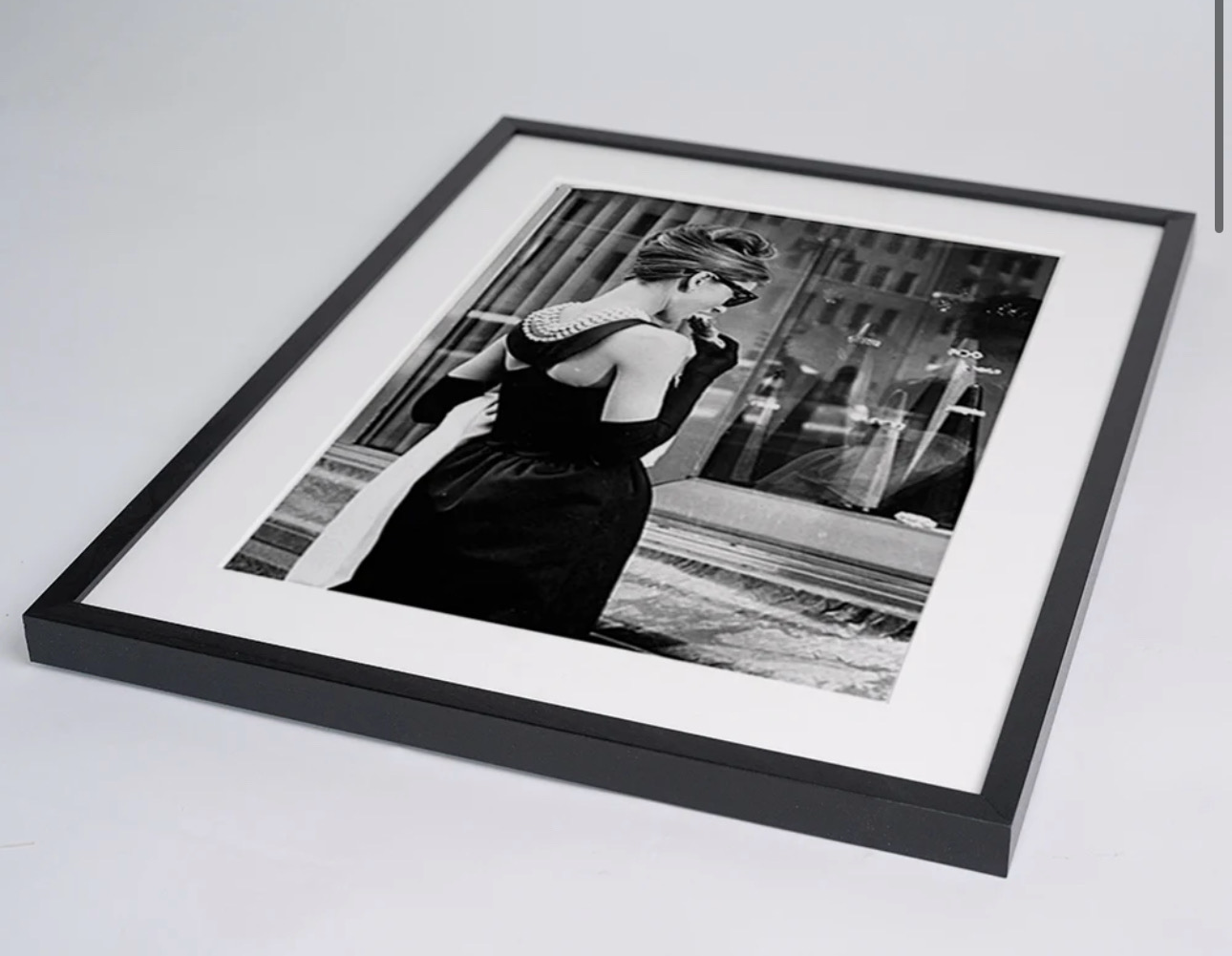 Ikonische Schwarz-Weiß-Fotografie aus dem Film „Frühstück bei Tiffany“. Audrey Hepburn, das Symbol zeitloser Eleganz, steht anmutig vor dem Schaufenster des legendären Juweliergeschäfts Tiffany & Co auf der Fifth Avenue in New York City. Audreys Figur, Holly Golightly, fesselt uns mit ihrem mühelosen Charme, während sie durch das Schaufenster des Ladens blickt, ihre Augen voller Staunen und Träume. Dieses Schwarz-Weiß-Bild repräsentiert Anmut, Stil und das Streben nach einem Hauch von Eleganz im Herzen der Stadt, die niemals schläft.