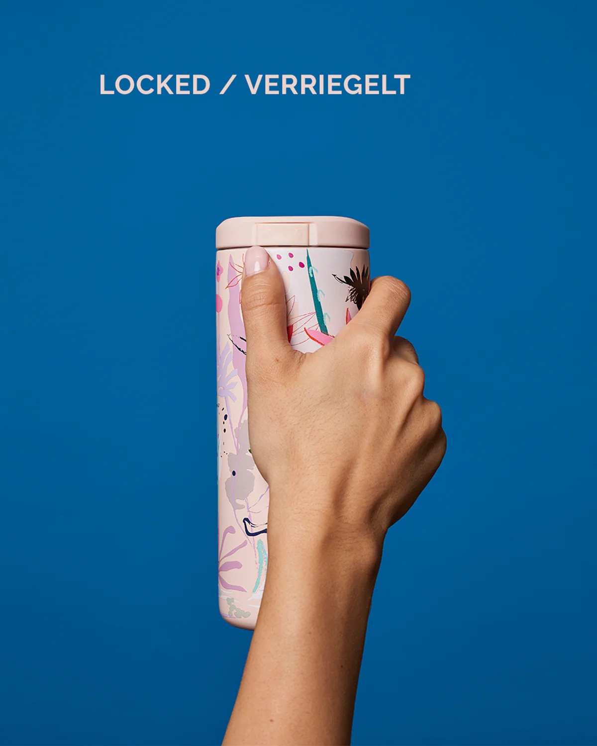 Hergestellt aus bis zu 90% recyceltem Edelstahl, verfügt der Becher über einen Schiebedeckel mit "Lock-Funktion", die zusätzlichen Schutz vor Auslaufen garantiert.