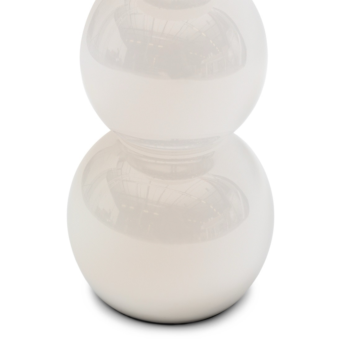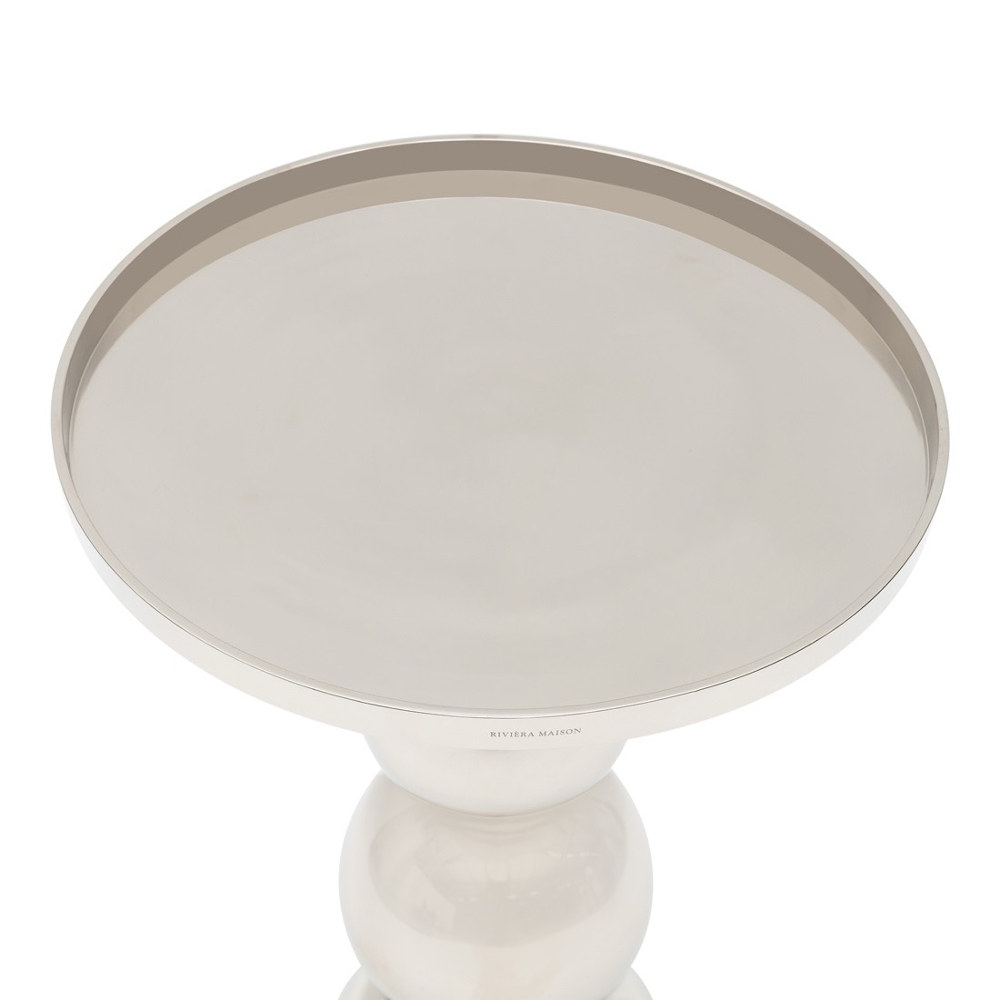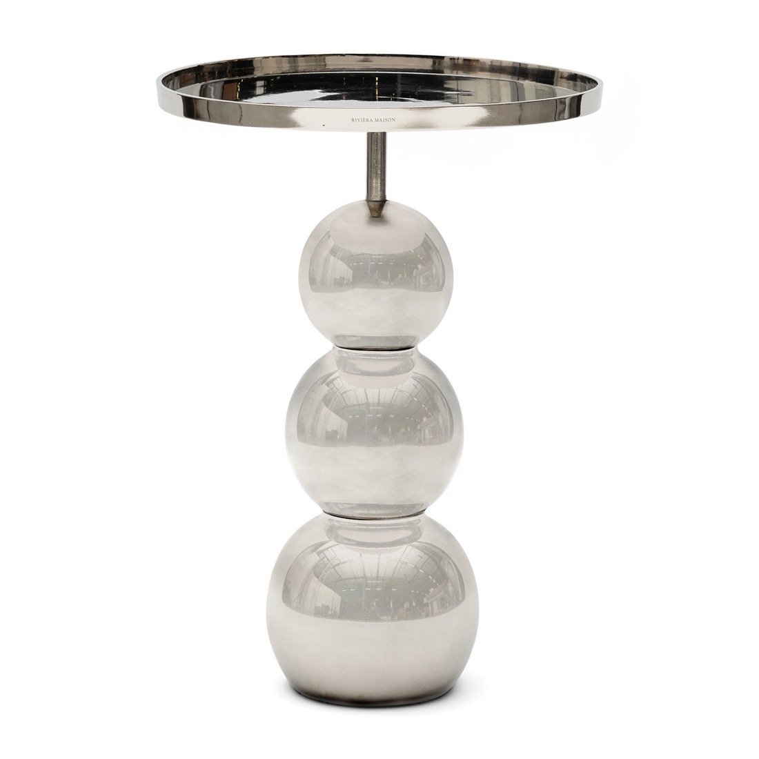 Beistelltisch aus glänzendem, silberfarbenen, Aluminium ist ein ganz besonderes Möbelstück. Der Fuß des Beistelltisches besteht aus großen, runden, silber glänzenden Perlen.